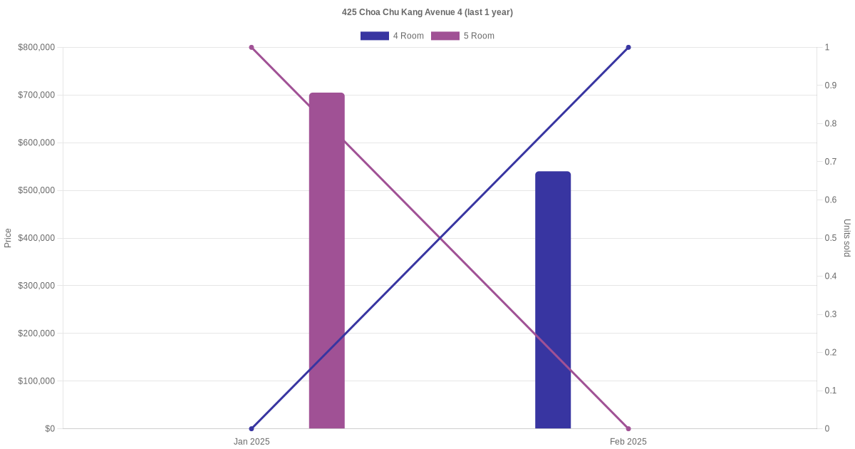 Below is a quick summary of the resale transactions volume and average price trends for the 4 room and 5 room units at 425 Choa Chu Kang Avenue 4.