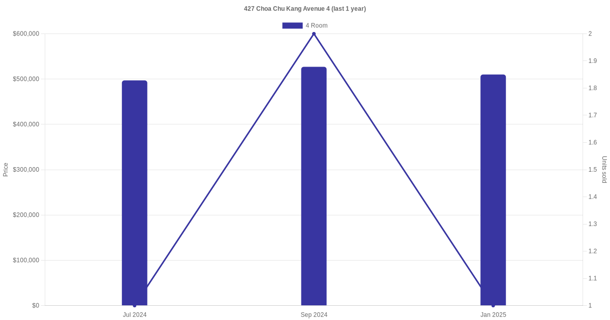 There were a total of 2 rental transactions in the last 3 years for units in block 427 Choa Chu Kang Avenue 4. The latest recorded one was in Apr 2024.