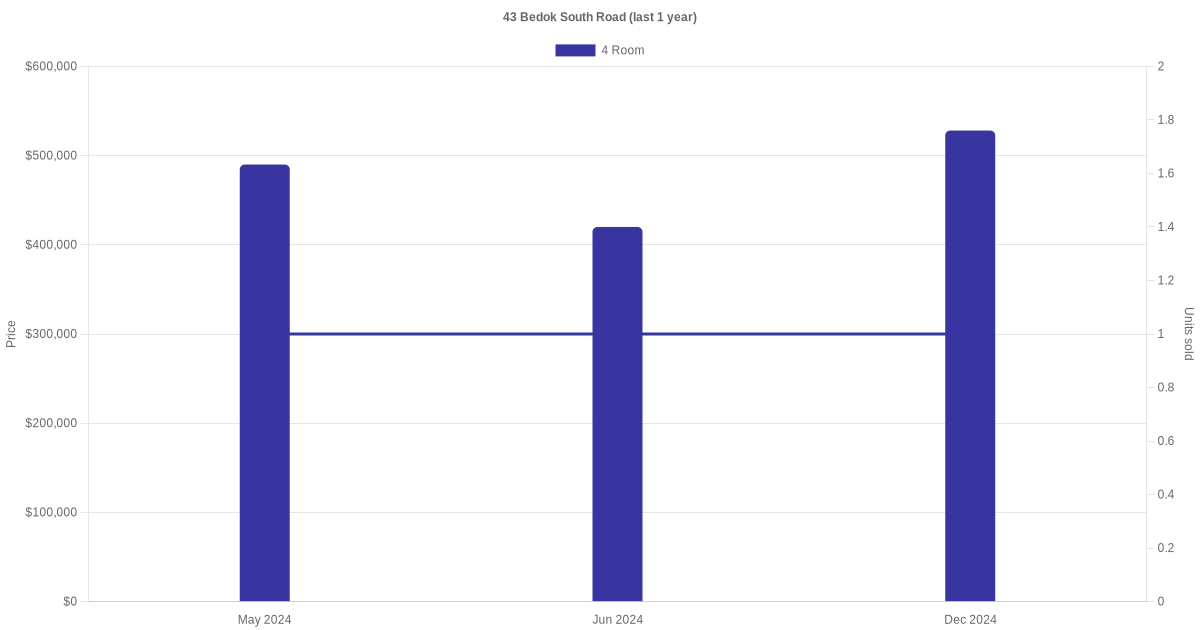 Below is a quick summary of the resale transactions volume and average price trends for the 4 room units at 43 Bedok South Road.
