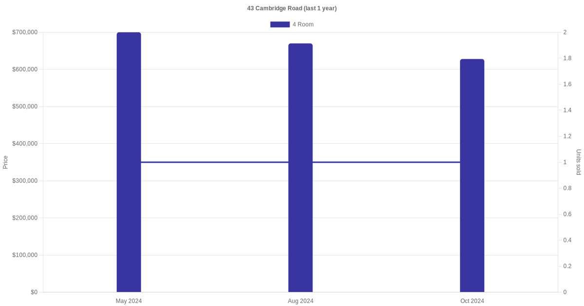 Below is a quick summary of the resale transactions volume and average price trends for the 4 room units at 43 Cambridge Road.