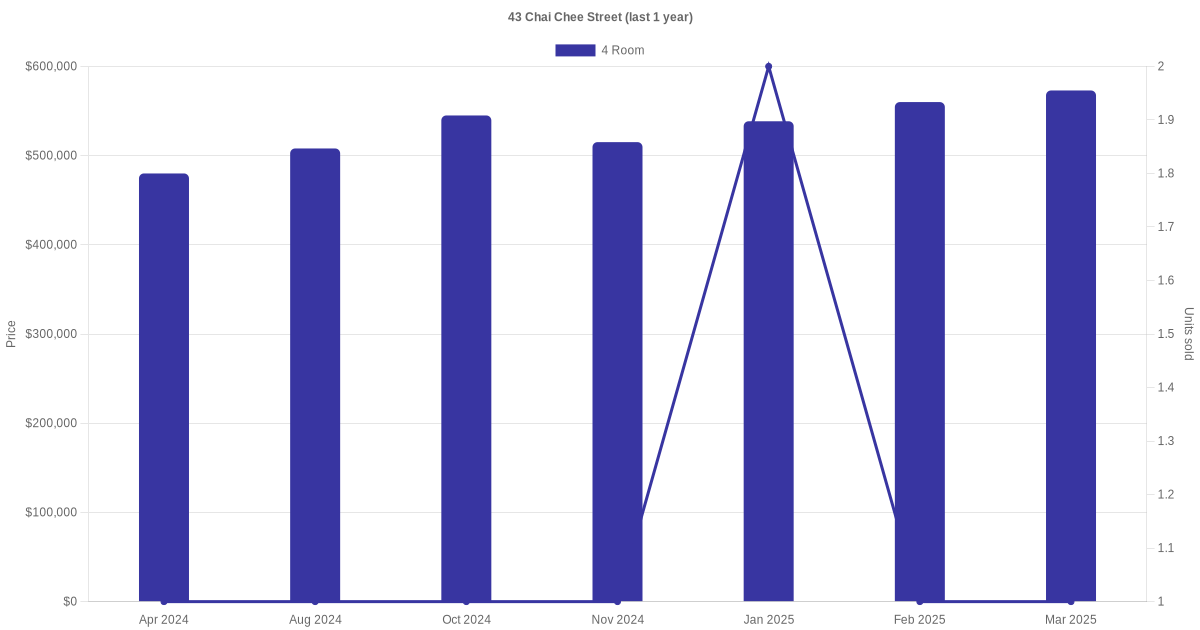 Below is a quick summary of the resale transactions volume and average price trends for the 4 room units at 43 Chai Chee Street.