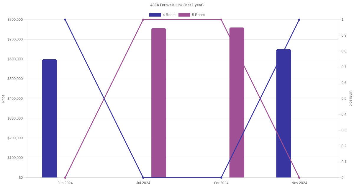 Below is a quick summary of the resale transactions volume and average price trends for the 4 room and 5 room units at 430A Fernvale Link.