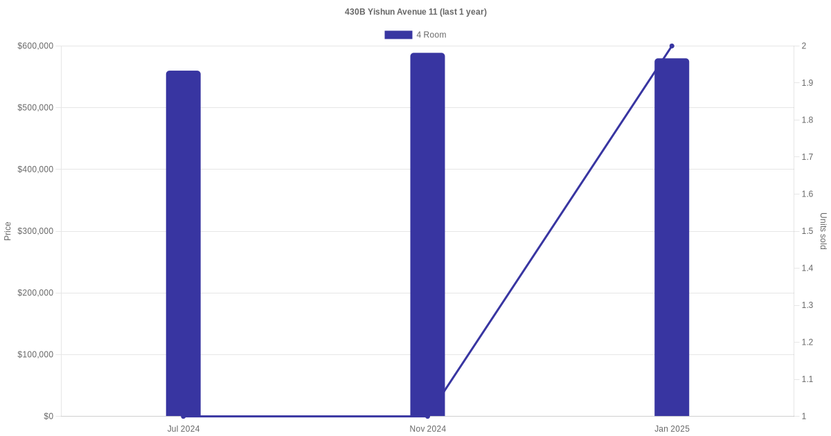 Below is a quick summary of the resale transactions volume and average price trends for the 4 room units at 430B Yishun Avenue 11.