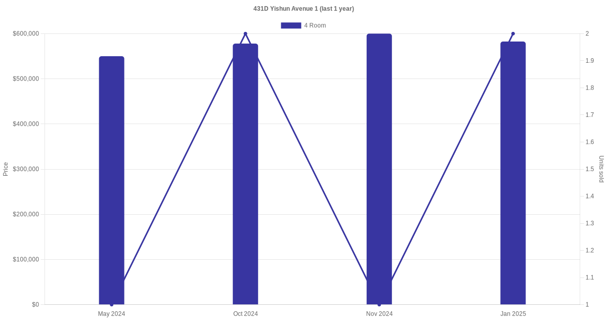 Below is a quick summary of the resale transactions volume and average price trends for the 4 room units at 431D Yishun Avenue 1.