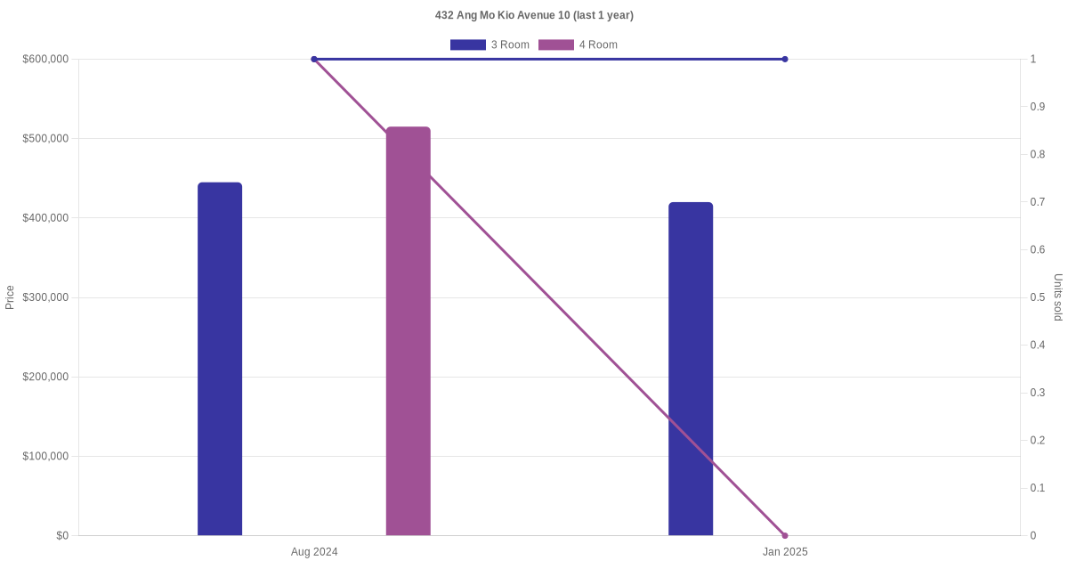 Below is a quick summary of the resale transactions volume and average price trends for the 3 room and 4 room units at 432 Ang Mo Kio Avenue 10.