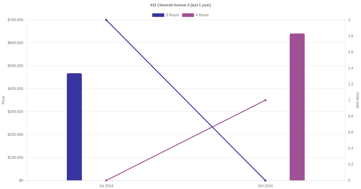 Below is a quick summary of the resale transactions volume and average price trends for the 3 room and 4 room units at 432 Clementi Avenue 3.