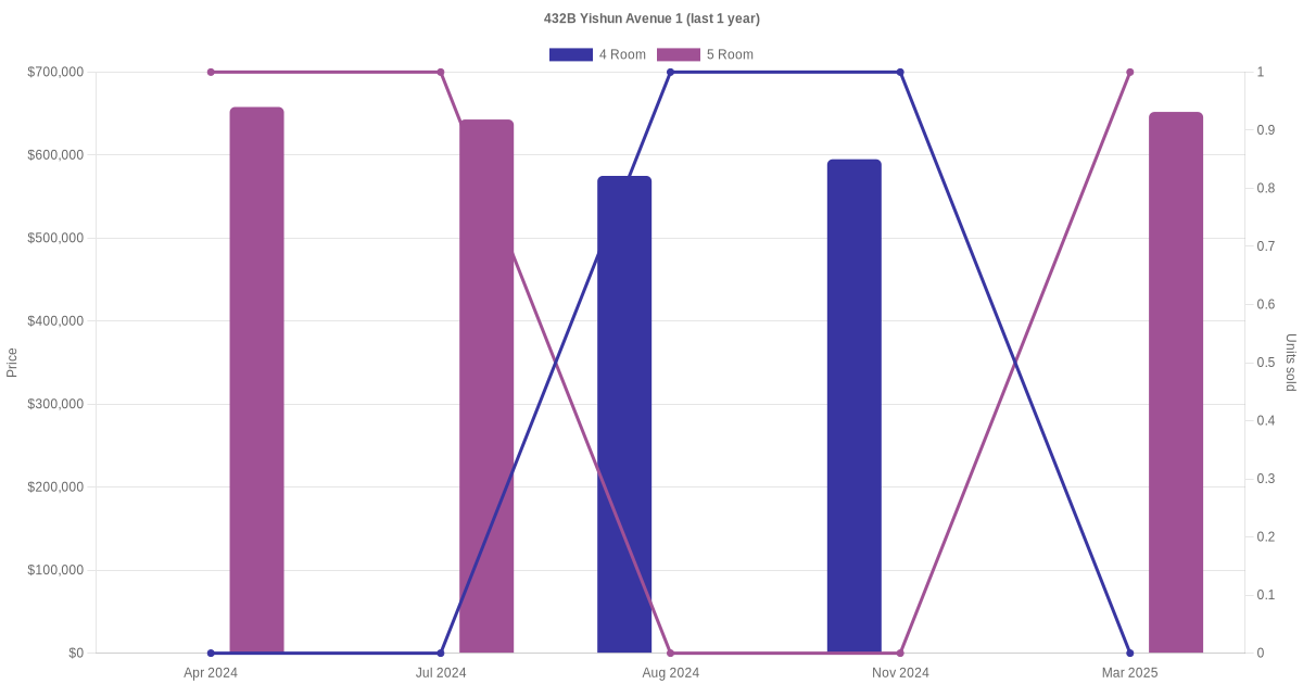 Below is a quick summary of the resale transactions volume and average price trends for the 4 room and 5 room units at 432B Yishun Avenue 1.