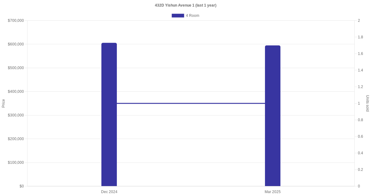 Below is a quick summary of the resale transactions volume and average price trends for the 4 room and 5 room units at 432D Yishun Avenue 1.