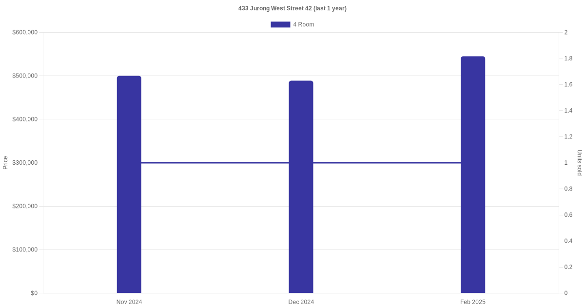 | Mar 2025 | $3,000 | 4 Room | Blk 433 Jurong West Street 42 4 Room | Jurong West |