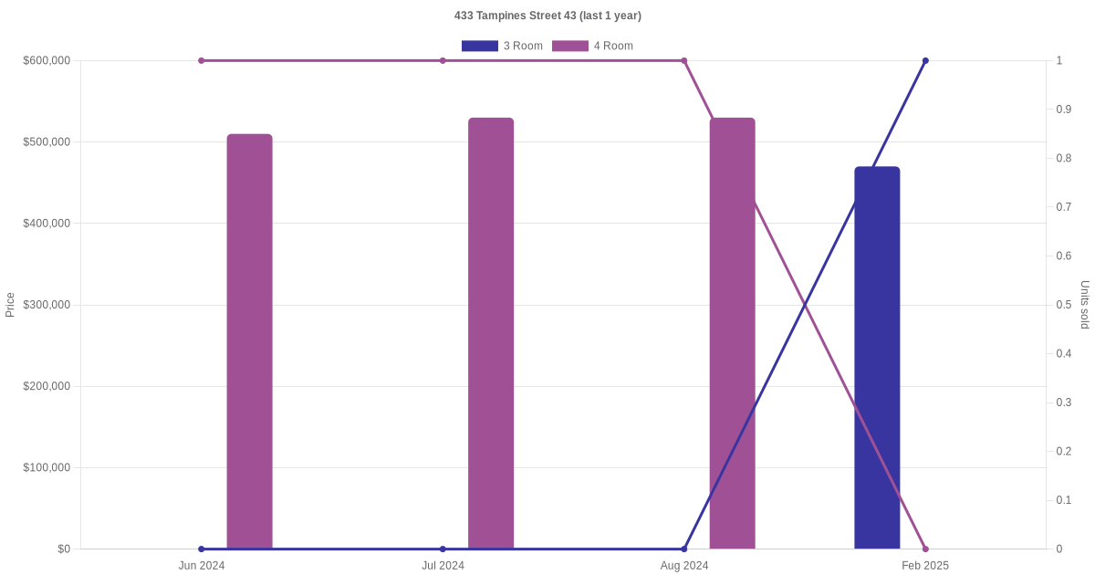 Below is a quick summary of the resale transactions volume and average price trends for the 3 room and 4 room units at 433 Tampines Street 43.