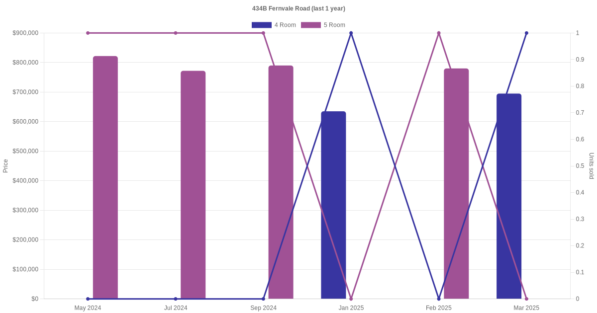 Below is a quick summary of the resale transactions volume and average price trends for the 4 room and 5 room units at 434B Fernvale Road.