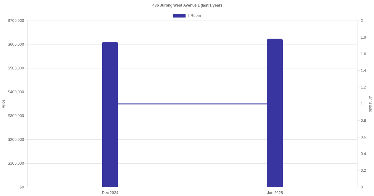 Below is a quick summary of the resale transactions volume and average price trends for the 5 room units at 436 Jurong West Avenue 1.