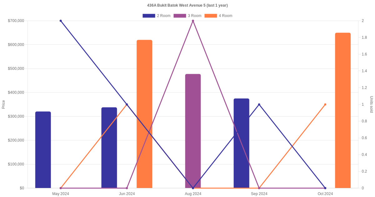 Below is a quick summary of the resale transactions volume and average price trends for the 2 room, 3 room and 4 room units at 436A Bukit Batok West Avenue 5.