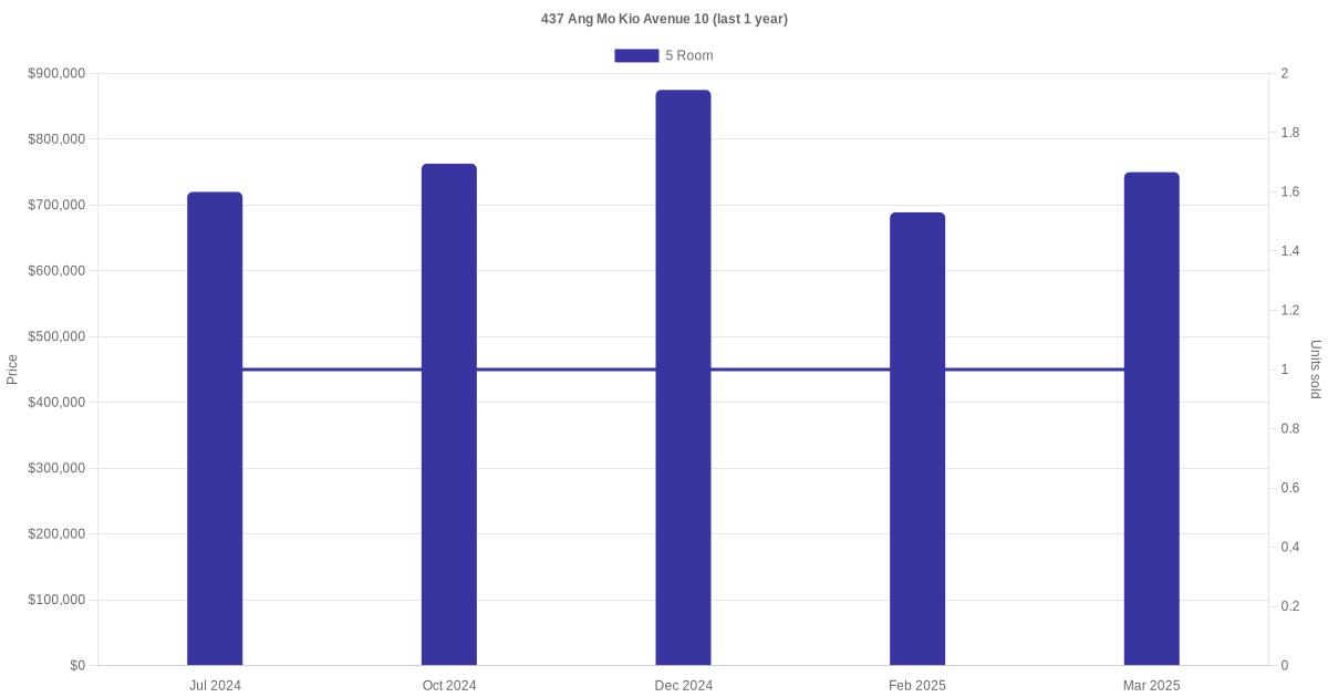 Below is a quick summary of the resale transactions volume and average price trends for the 5 room units at 437 Ang Mo Kio Avenue 10.