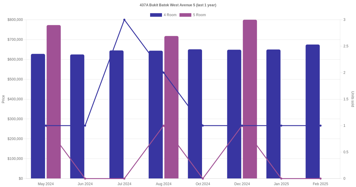 Below is a quick summary of the resale transactions volume and average price trends for the 4 room and 5 room units at 437A Bukit Batok West Avenue 5.