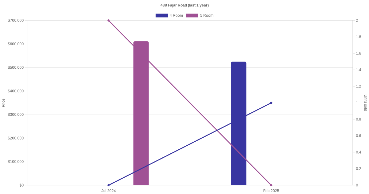 Below is a quick summary of the resale transactions volume and average price trends for the 4 room and 5 room units at 438 Fajar Road.