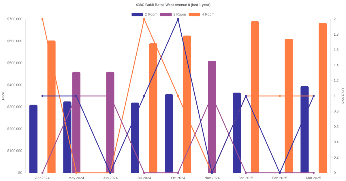Below is a quick summary of the resale transactions volume and average price trends for the 2 room, 3 room and 4 room units at 438C Bukit Batok West Avenue 8.