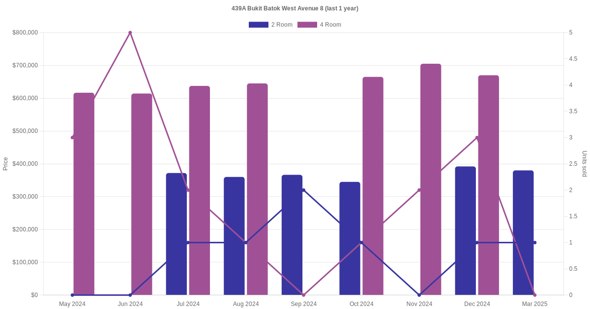 Below is a quick summary of the resale transactions volume and average price trends for the 2 room and 4 room units at 439A Bukit Batok West Avenue 8.