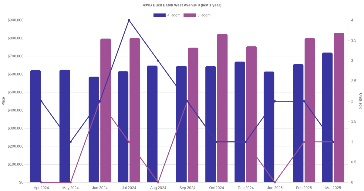 Below is a quick summary of the resale transactions volume and average price trends for the 4 room and 5 room units at 439B Bukit Batok West Avenue 8.