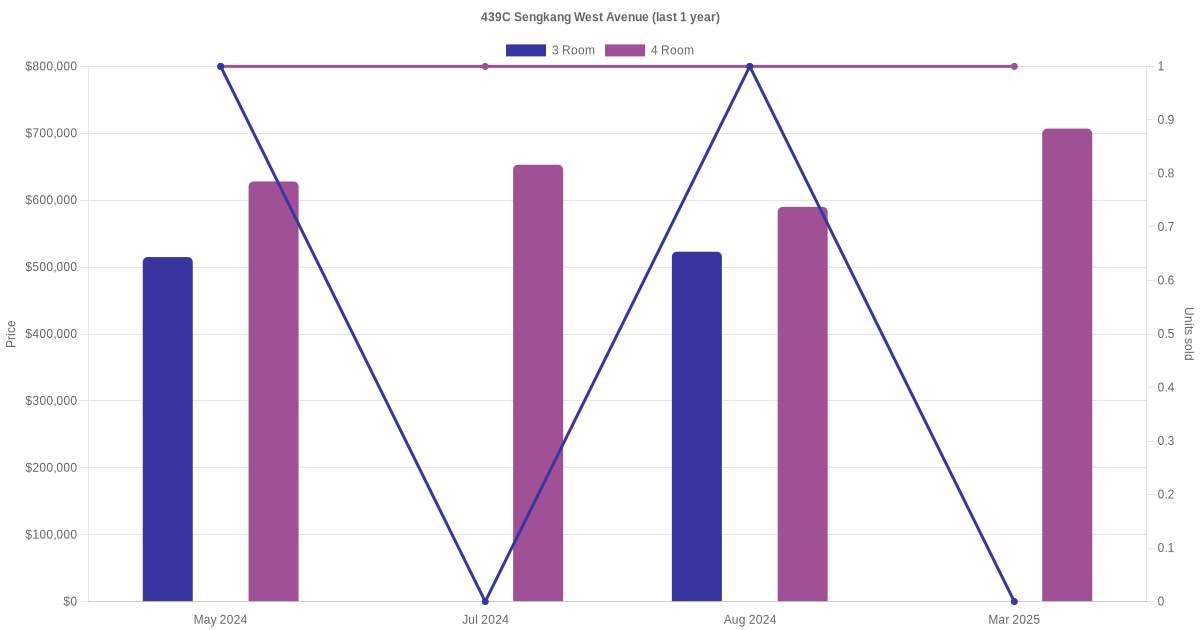 Below is a quick summary of the resale transactions volume and average price trends for the 3 room and 4 room units at 439C Sengkang West Avenue.