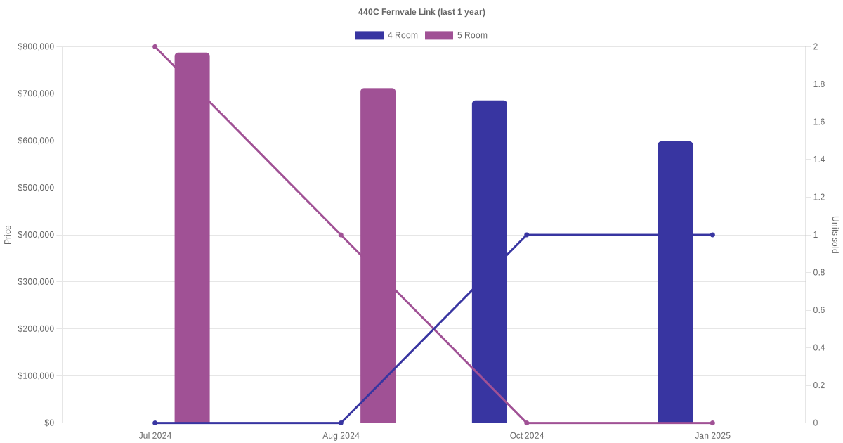 Below is a quick summary of the resale transactions volume and average price trends for the 4 room and 5 room units at 440C Fernvale Link.