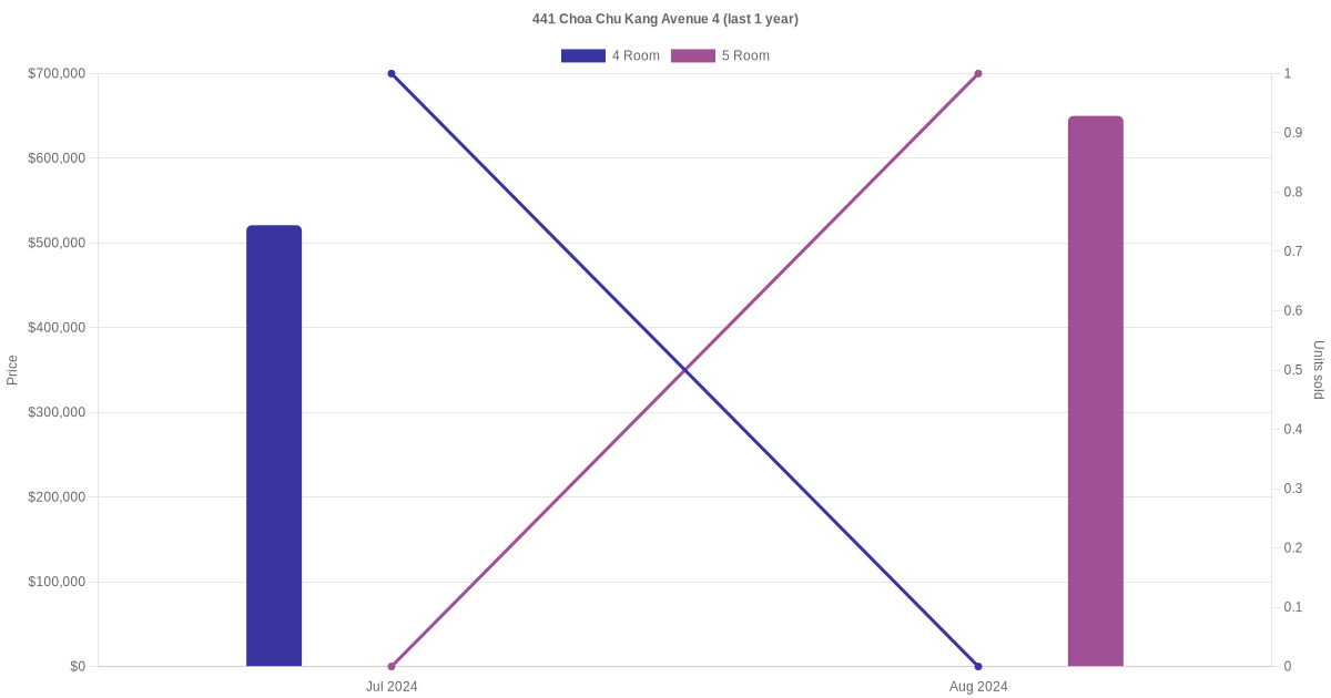 Below is a quick summary of the resale transactions volume and average price trends for the 4 room and 5 room units at 441 Choa Chu Kang Avenue 4.