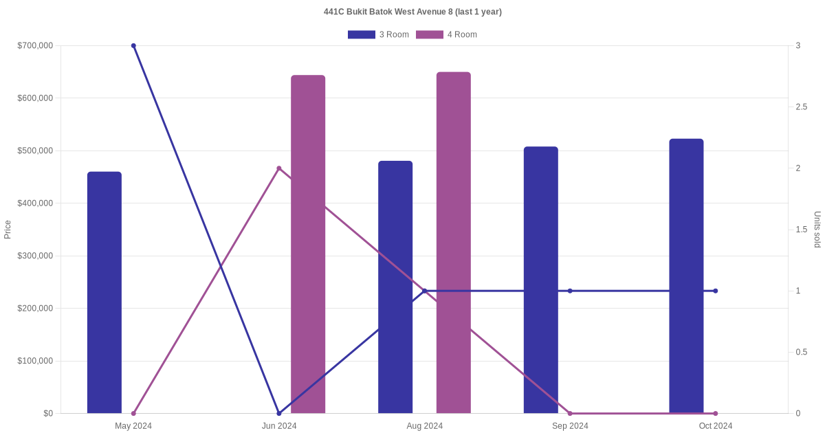 Below is a quick summary of the resale transactions volume and average price trends for the 3 room and 4 room units at 441C Bukit Batok West Avenue 8.