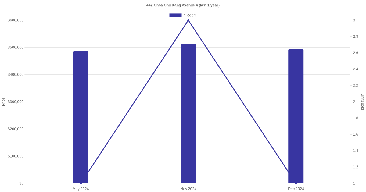 Below is a quick summary of the resale transactions volume and average price trends for the 4 room units at 442 Choa Chu Kang Avenue 4.