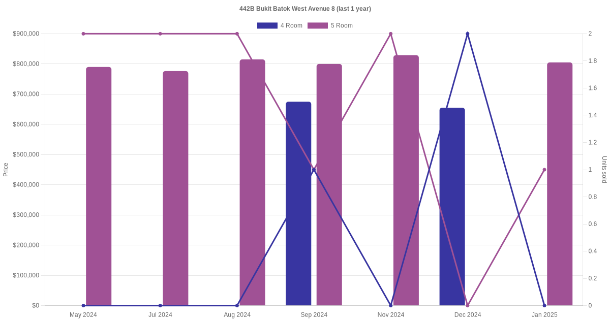 Below is a quick summary of the resale transactions volume and average price trends for the 4 room and 5 room units at 442B Bukit Batok West Avenue 8.