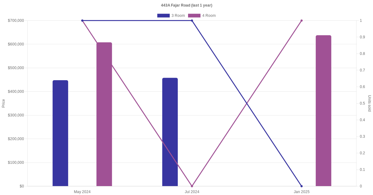 Below is a quick summary of the resale transactions volume and average price trends for the 3 room and 4 room units at 443A Fajar Road.