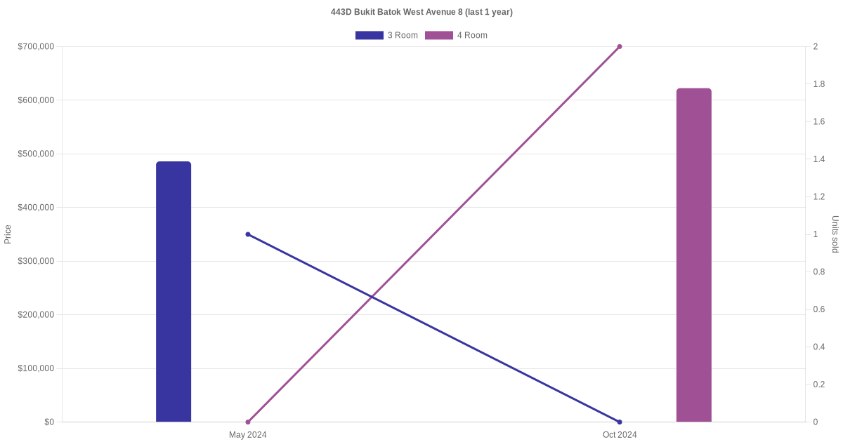 Below is a quick summary of the resale transactions volume and average price trends for the 3 room and 4 room units at 443D Bukit Batok West Avenue 8.