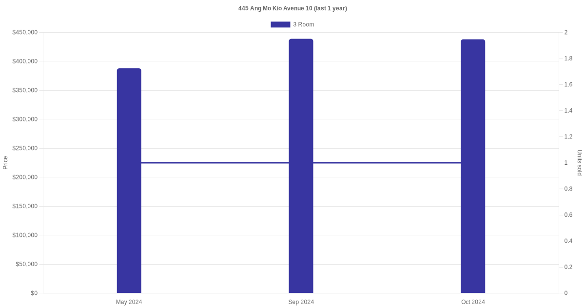 Below is a quick summary of the resale transactions volume and average price trends for the 3 room units at 445 Ang Mo Kio Avenue 10.