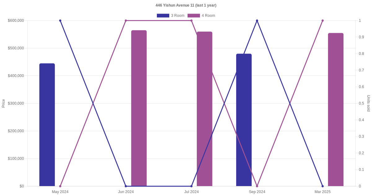 Below is a quick summary of the resale transactions volume and average price trends for the 3 room and 4 room units at 446 Yishun Avenue 11.