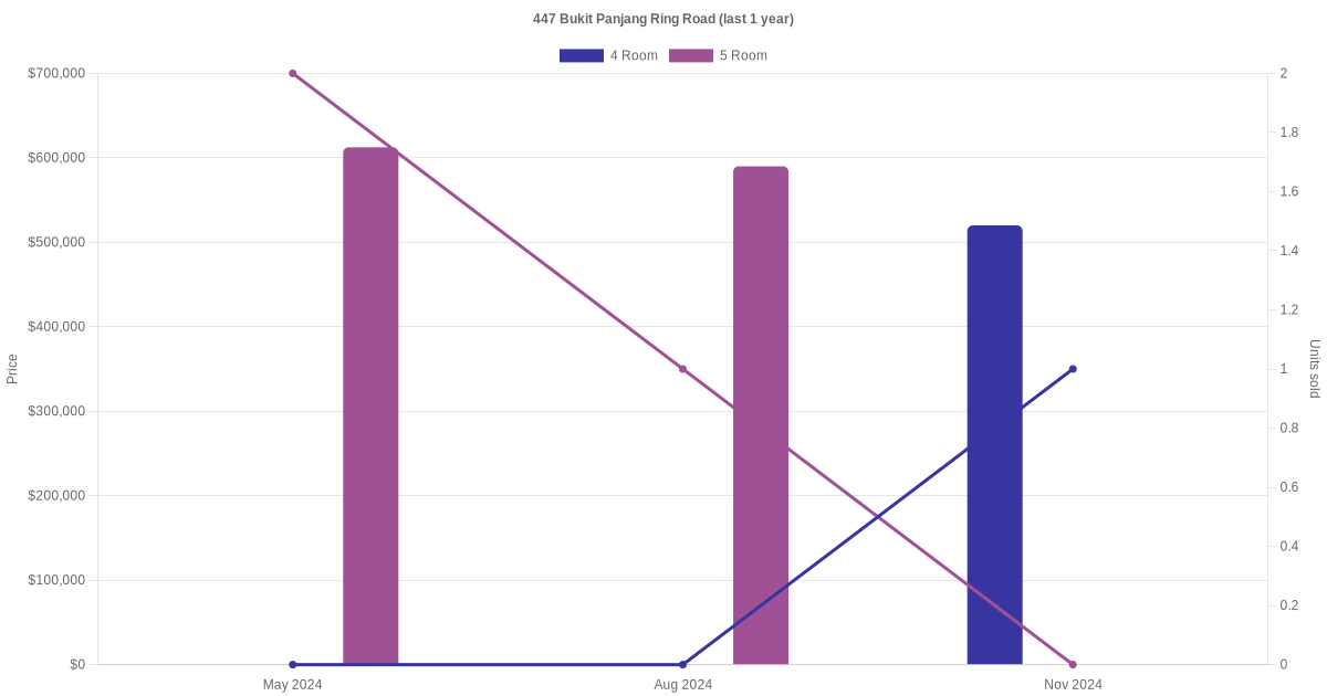 Below is a quick summary of the resale transactions volume and average price trends for the 4 room and 5 room units at 447 Bukit Panjang Ring Road.