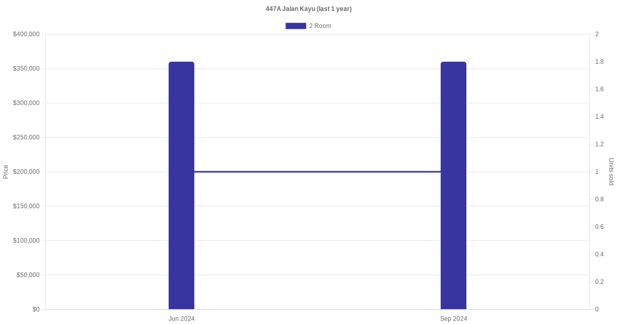 Below is a quick summary of the resale transactions volume and average price trends for the 2 room and 3 room units at 447A Jalan Kayu.