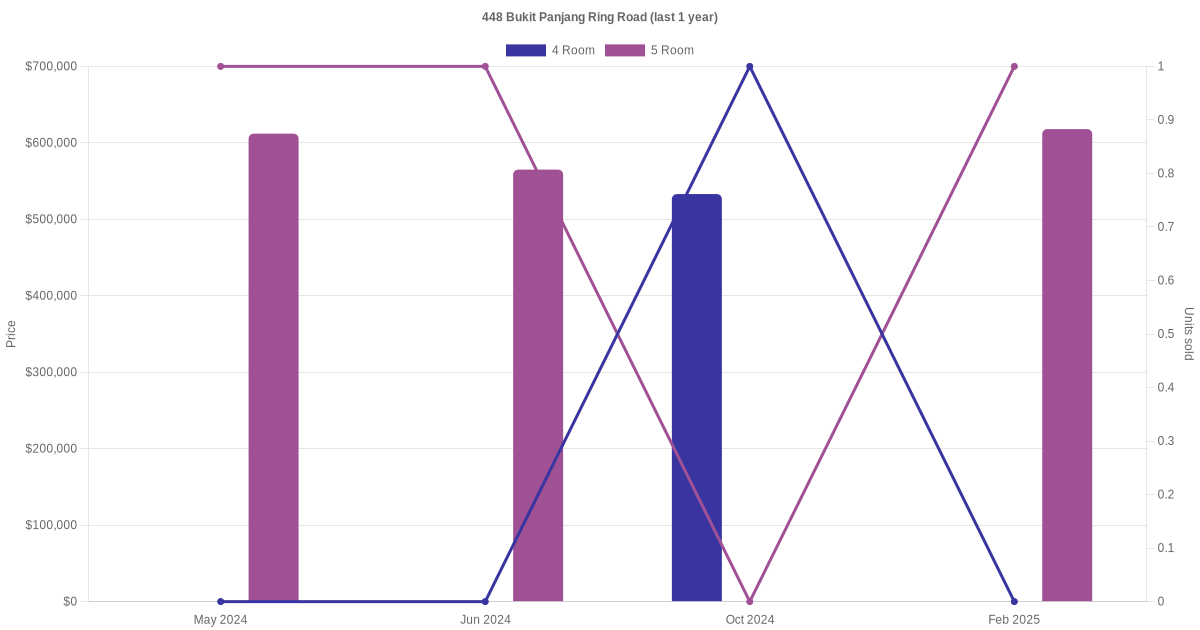 Below is a quick summary of the resale transactions volume and average price trends for the 4 room and 5 room units at 448 Bukit Panjang Ring Road.