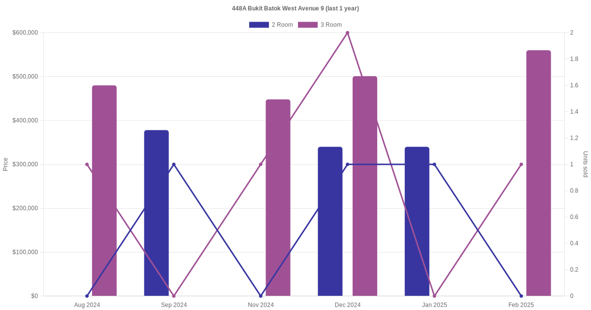 Below is a quick summary of the resale transactions volume and average price trends for the 2 room and 3 room units at 448A Bukit Batok West Avenue 9.