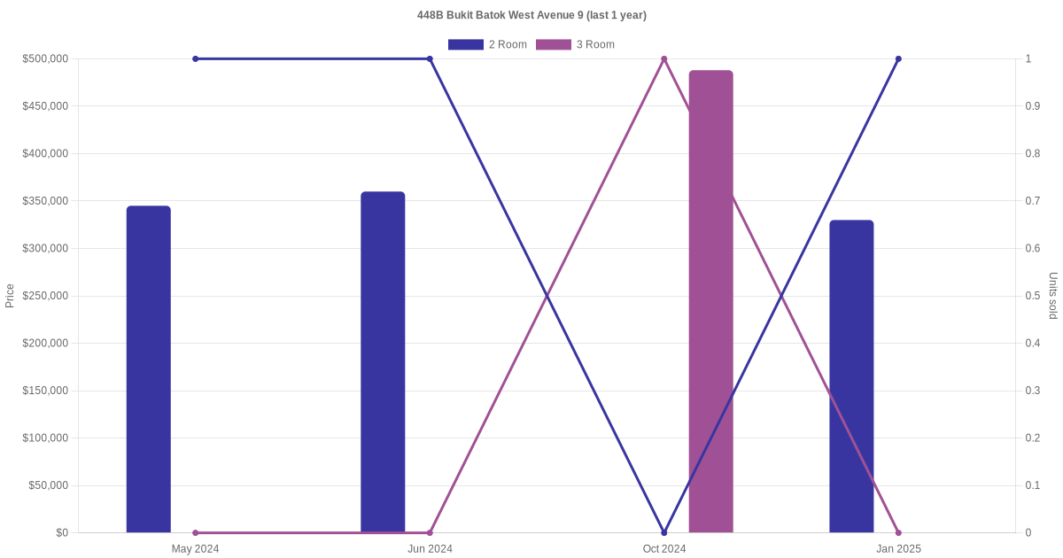 Below is a quick summary of the resale transactions volume and average price trends for the 2 room and 3 room units at 448B Bukit Batok West Avenue 9.