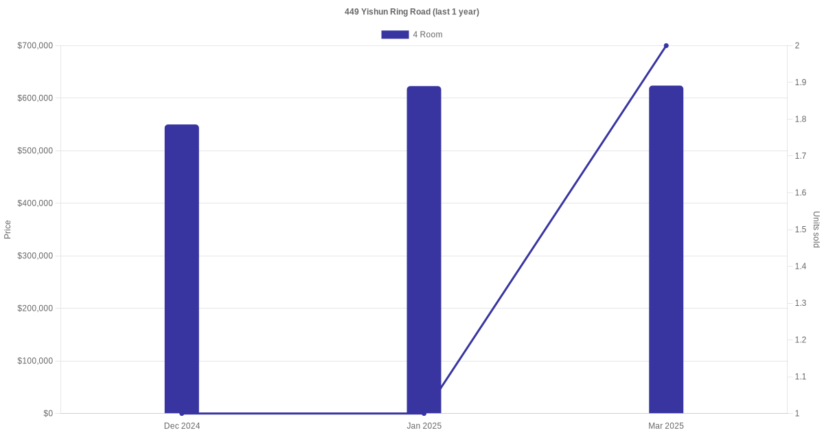 Below is a quick summary of the resale transactions volume and average price trends for the 4 room units at 449 Yishun Ring Road.