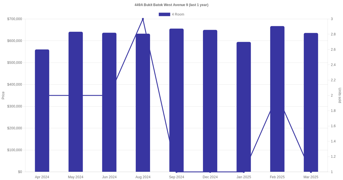 Below is a quick summary of the resale transactions volume and average price trends for the 4 room units at 449A Bukit Batok West Avenue 9.