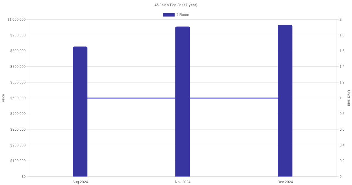 Below is a quick summary of the resale transactions volume and average price trends for the 4 room and 5 room units at 45 Jalan Tiga.