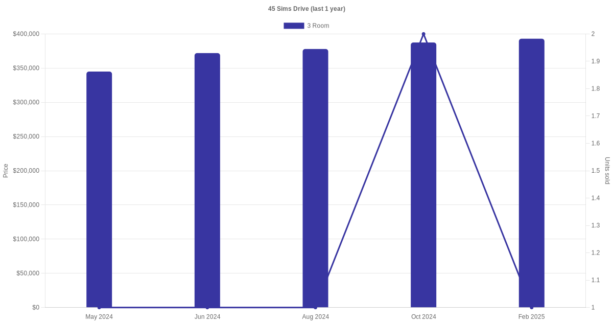 Below is a quick summary of the resale transactions volume and average price trends for the 3 room units at 45 Sims Drive.