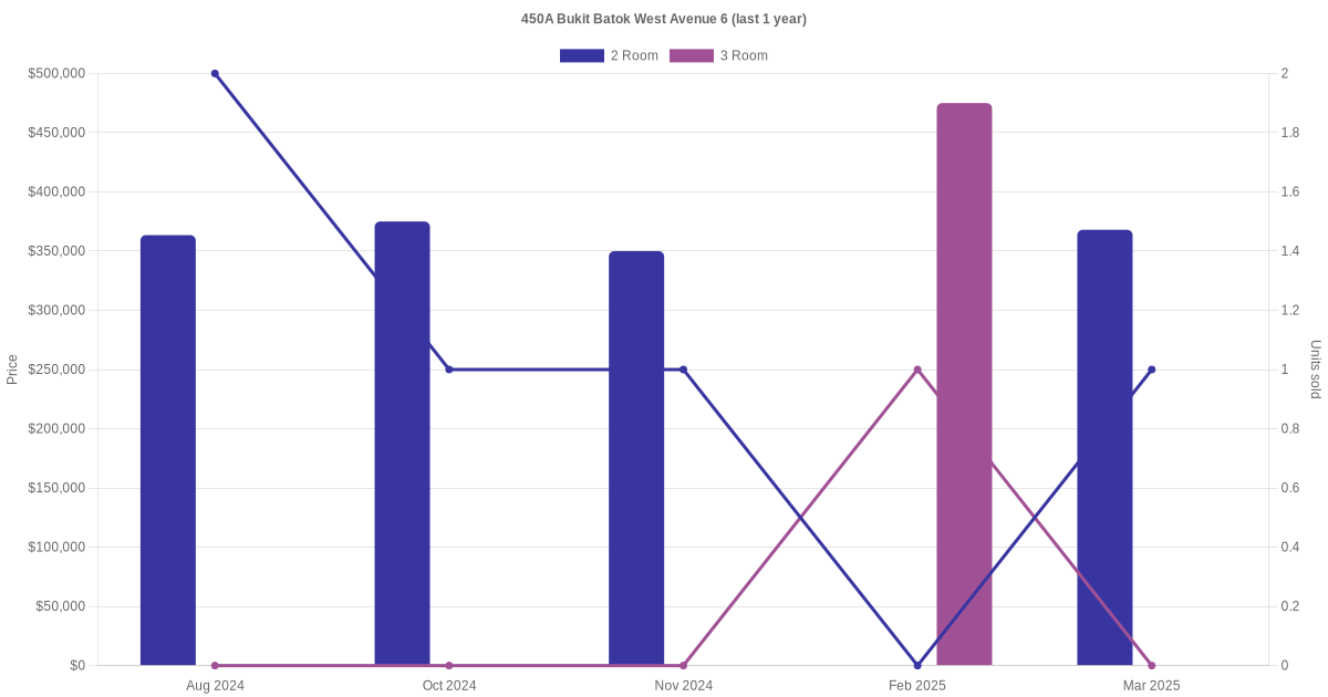 Below is a quick summary of the resale transactions volume and average price trends for the 2 room and 3 room units at 450A Bukit Batok West Avenue 6.