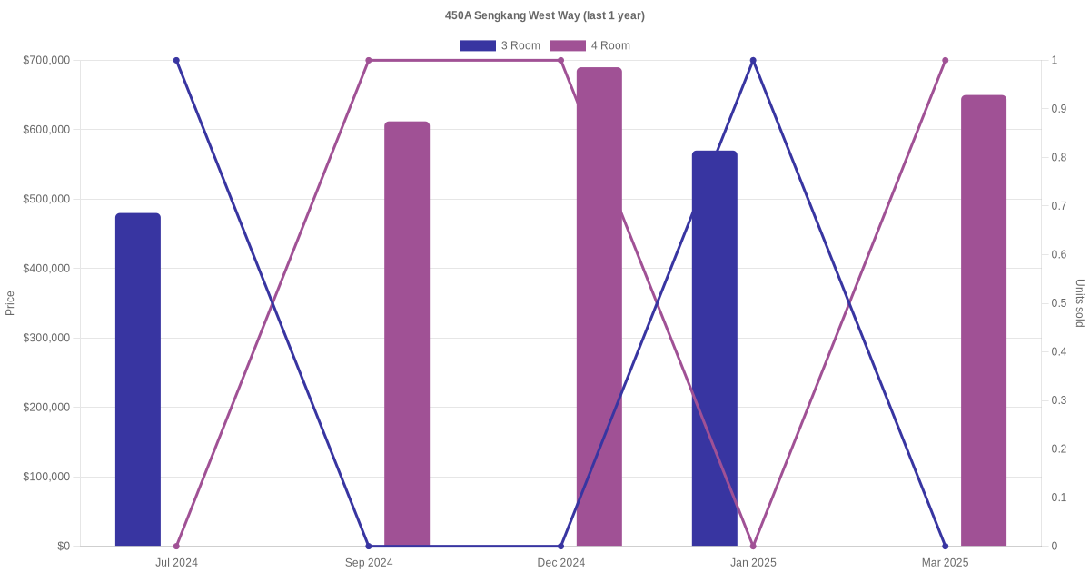Below is a quick summary of the resale transactions volume and average price trends for the 3 room and 4 room units at 450A Sengkang West Way.