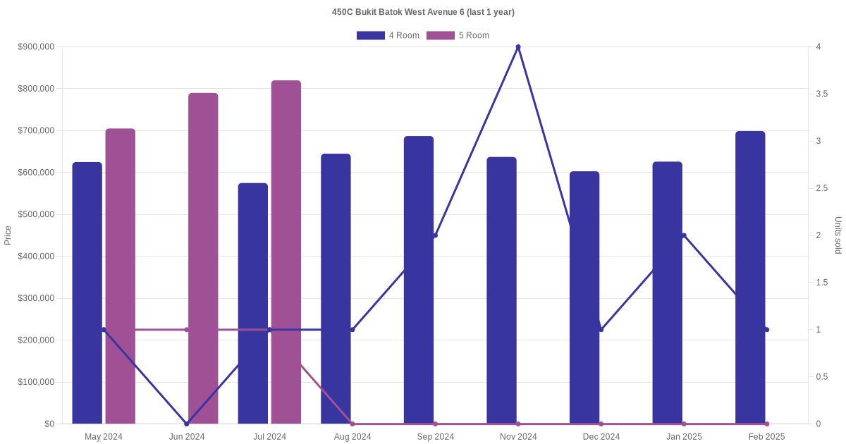 Below is a quick summary of the resale transactions volume and average price trends for the 4 room and 5 room units at 450C Bukit Batok West Avenue 6.