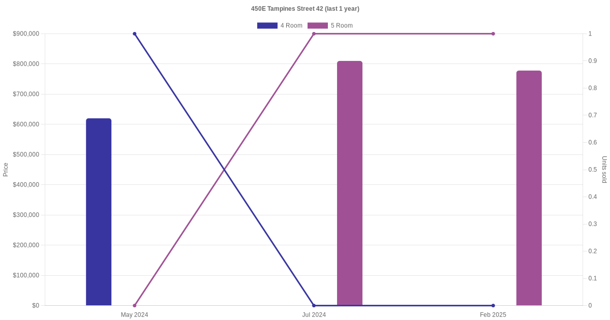 Below is a quick summary of the resale transactions volume and average price trends for the 4 room and 5 room units at 450E Tampines Street 42.