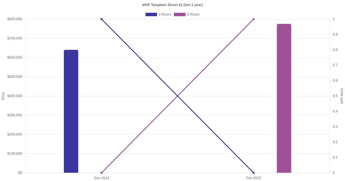 Below is a quick summary of the resale transactions volume and average price trends for the 4 room and 5 room units at 450F Tampines Street 42.