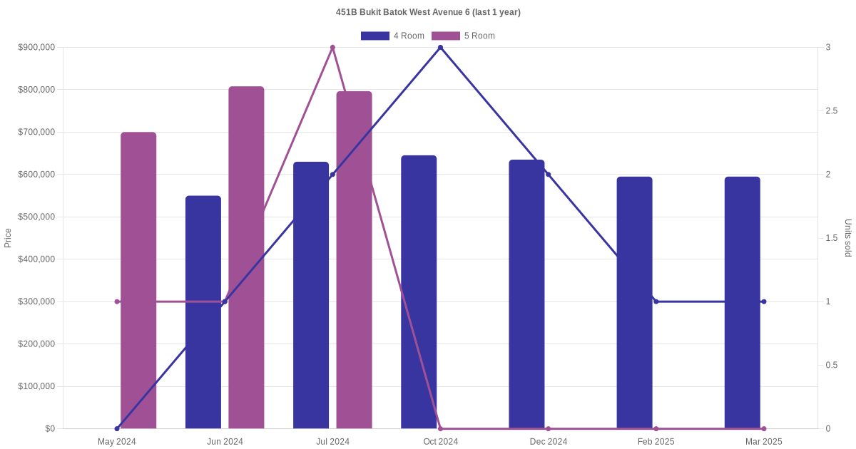Below is a quick summary of the resale transactions volume and average price trends for the 4 room and 5 room units at 451B Bukit Batok West Avenue 6.