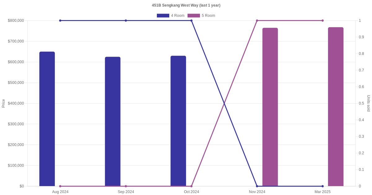 Below is a quick summary of the resale transactions volume and average price trends for the 4 room and 5 room units at 451B Sengkang West Way.