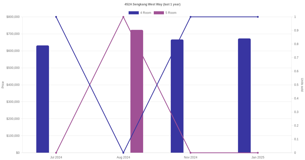 Below is a quick summary of the resale transactions volume and average price trends for the 4 room and 5 room units at 452A Sengkang West Way.